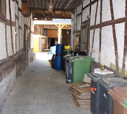Separate Scheune (kein Denkmalschutz) ist aus bauphysikalischer Sicht ausbaufähig – ein Bauantrag liegt nicht vor. Innenhof, kleiner Gartenbereich rückwärtig (nicht angelegt).