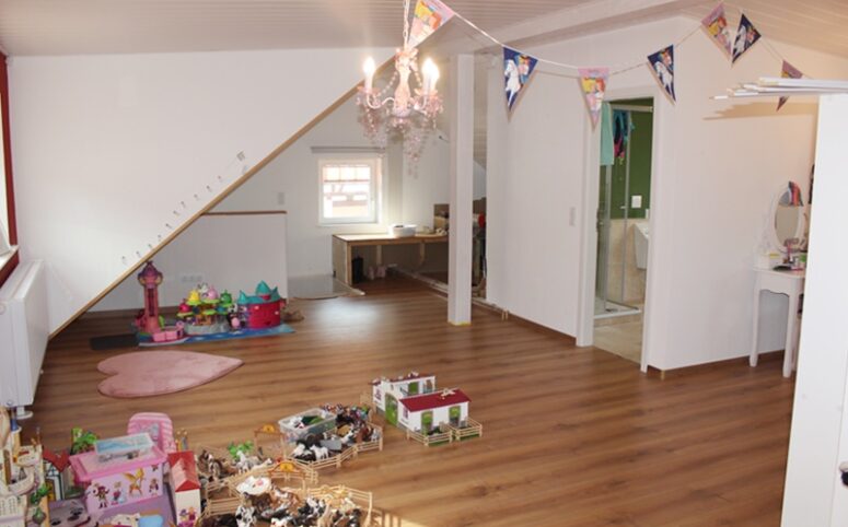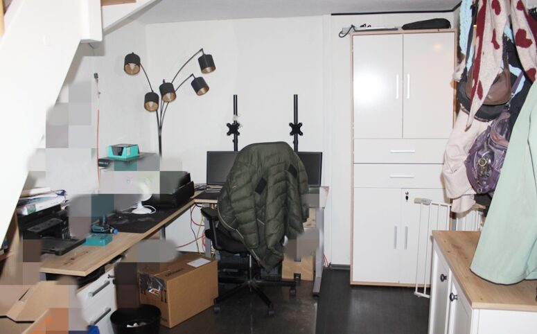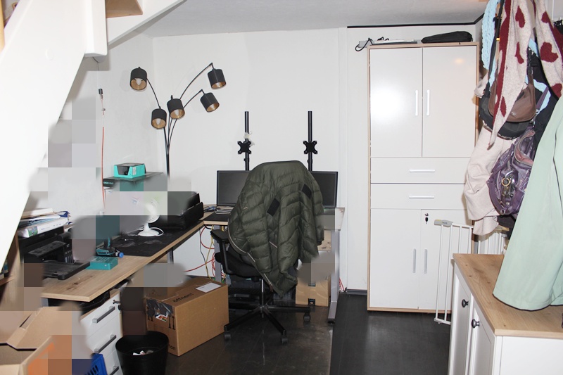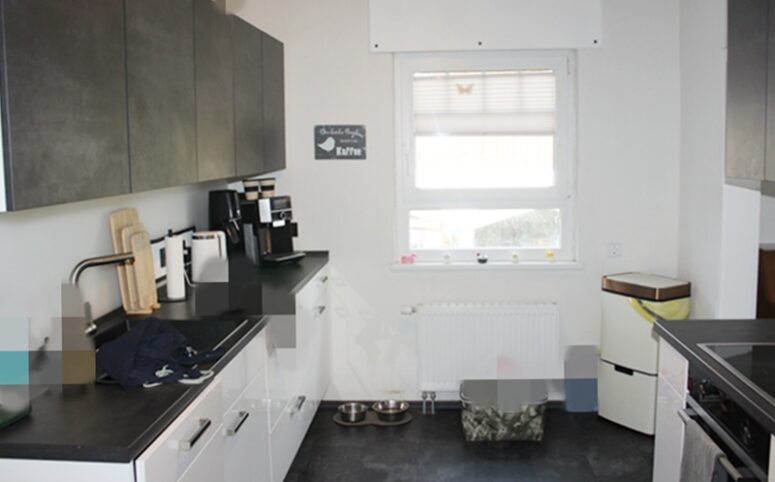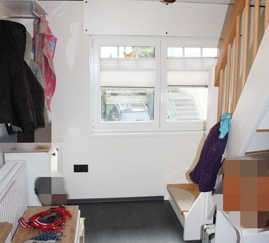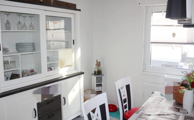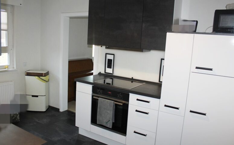 Über eine Treppe erreichen Sie die erste Etage mit einem Schlafzimmer, einem hellen Wohnzimmer, einer Küche mit Einbauküche und Zugang zum Esszimmer, einem Tageslichtbad mit Badewanne sowie einer separaten Toilette. Ergänzt wird diese Etage durch ein Durchgangszimmer, das sich ideal als Büro eignet.