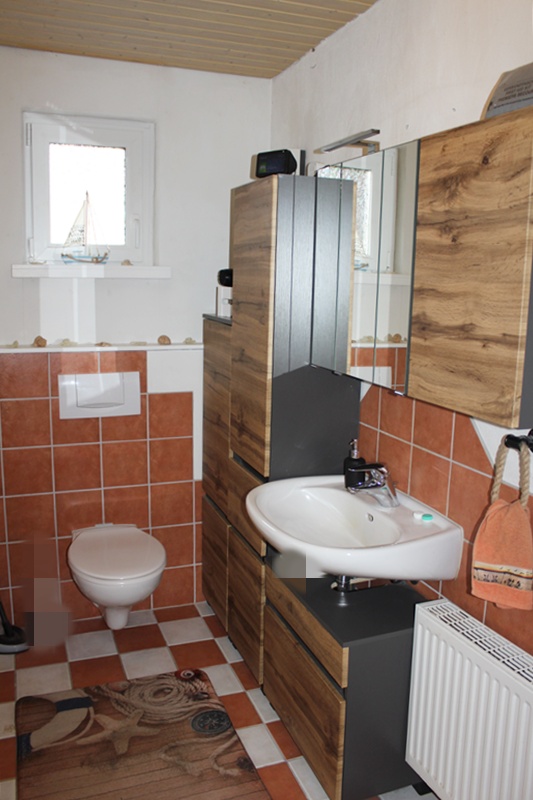 Das Obergeschoss bietet Platz für ein weiteres Schlafzimmer sowie ein helles Badezimmer mit Dusche und Tageslicht. Zwei Kellerräume, eine kleine Scheune bzw. Garage und einem kleinen Garten hinter dem Haus runden das Platzangebot ab.