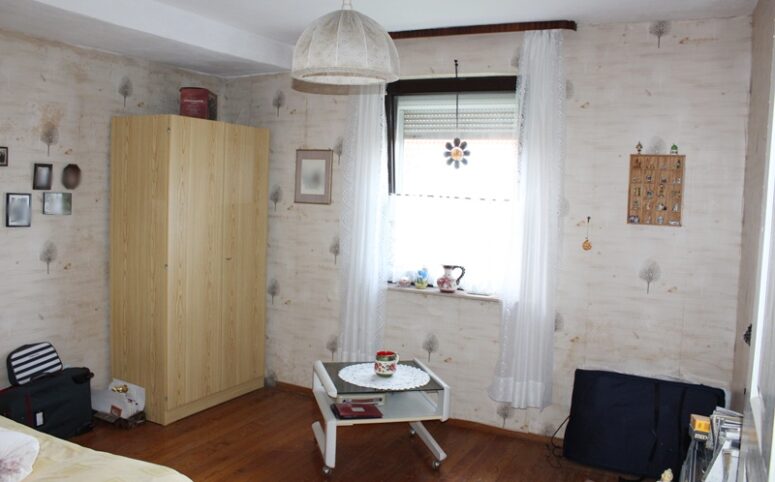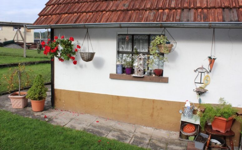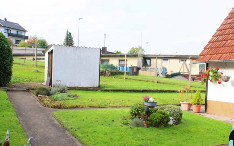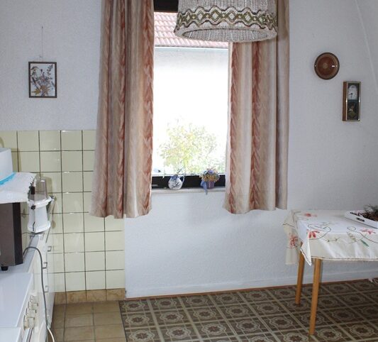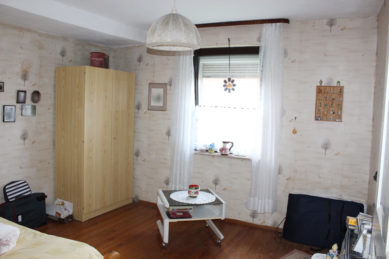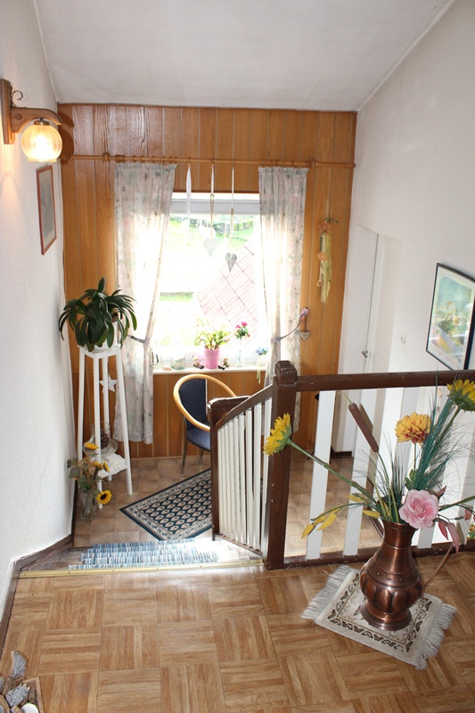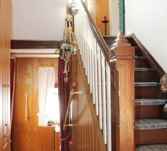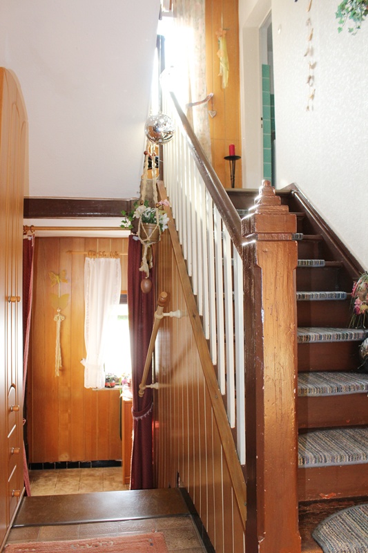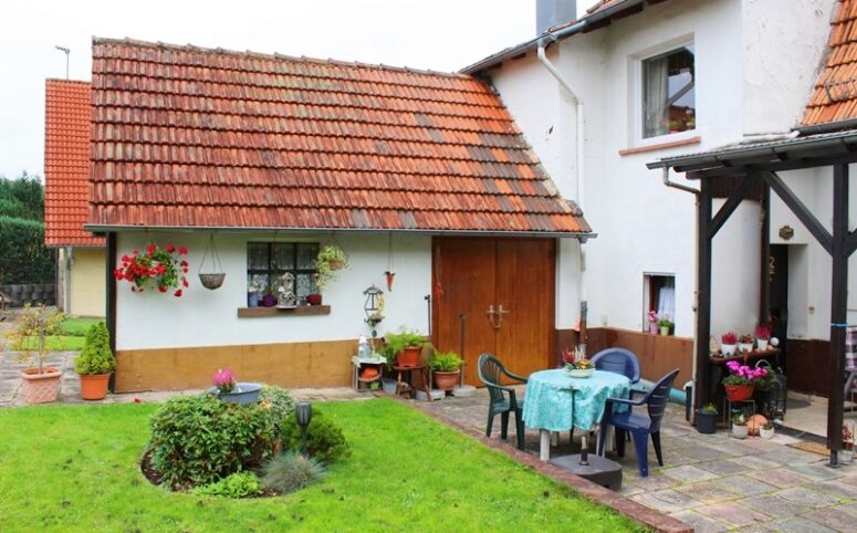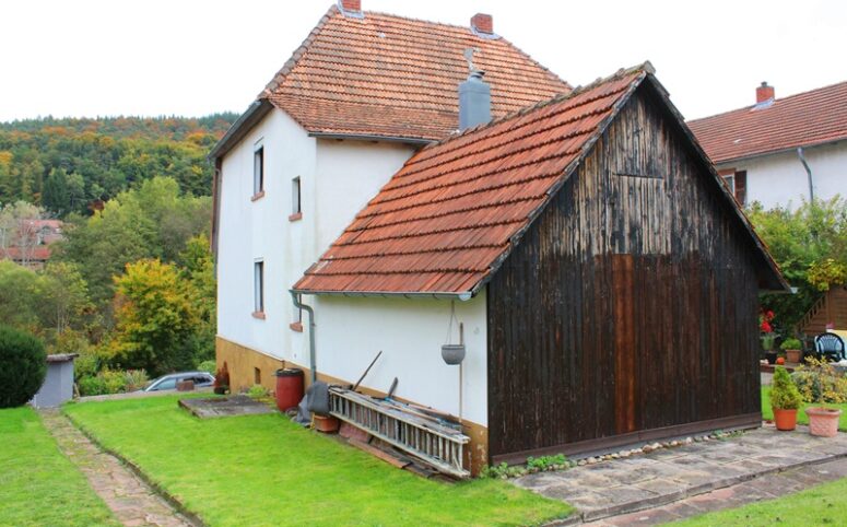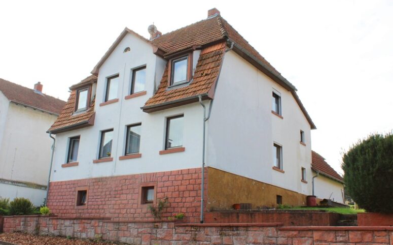 Das Haus befindet sich am hinteren Teil des Grundstücks mit Zugang von der Rückseite. Im Erdgeschoss liegen die Küche, das Esszimmer als Durchgangszimmer zum angrenzenden Wohnzimmer, ein Schlafzimmer sowie ein Duschbad. Im Obergeschoss befinden sich drei Schlafzimmer, ein weiteres Zimmer, das früher als zweite Küche genutzt wurde, sowie ein Wannenbad. Die Immobilie ist vollunterkellert; eine kleine Scheune ergänzt das Platzangebot. Auf der hinteren Grundstücksgrenze befindet sich das Carport. Der Garten ist überwiegend ebenerdig und lässt sich vielseitig nutzen.