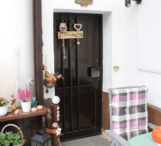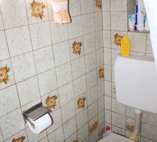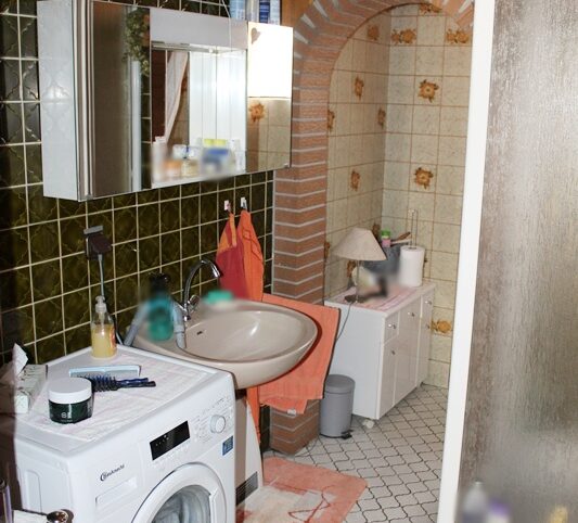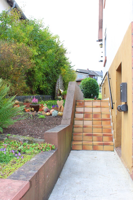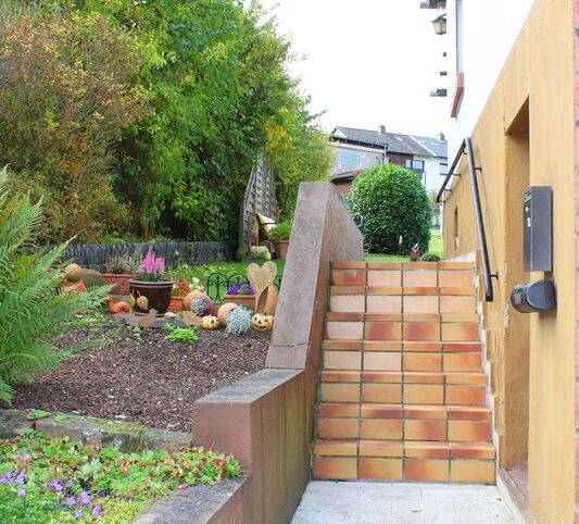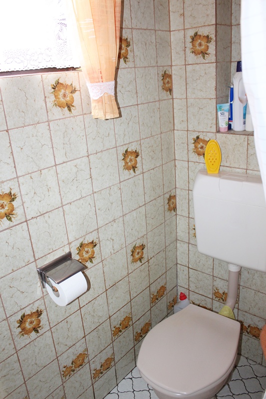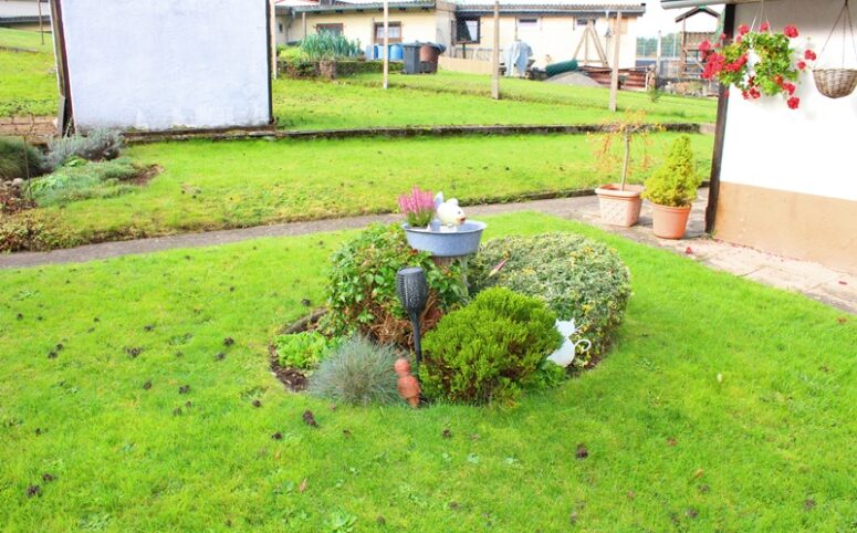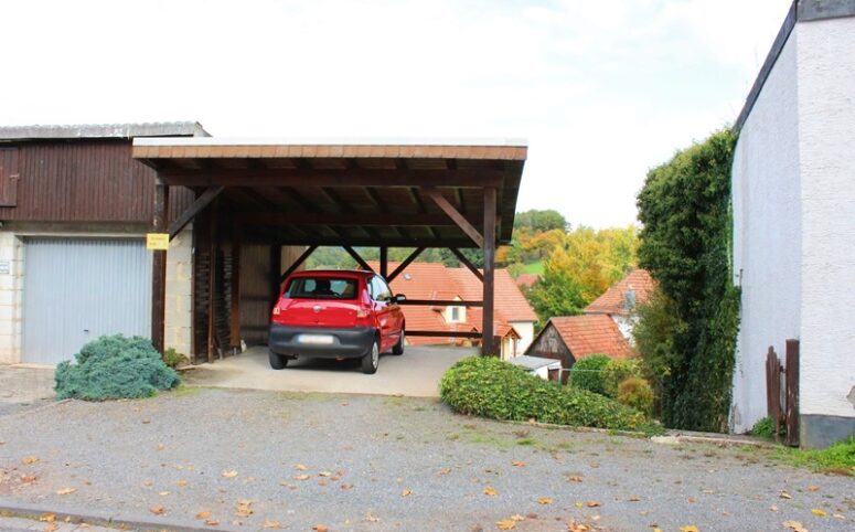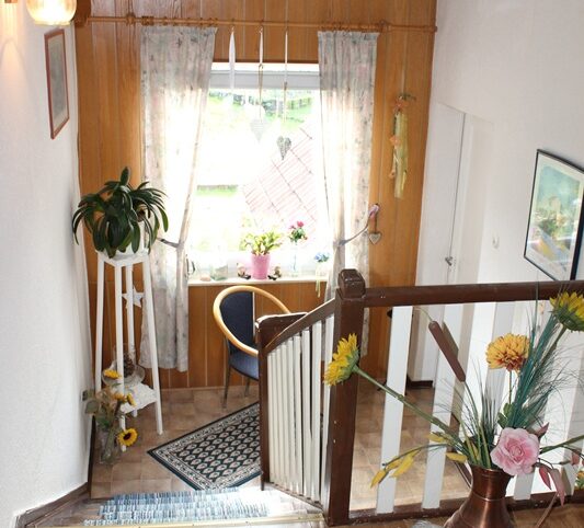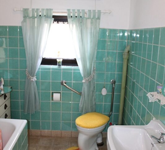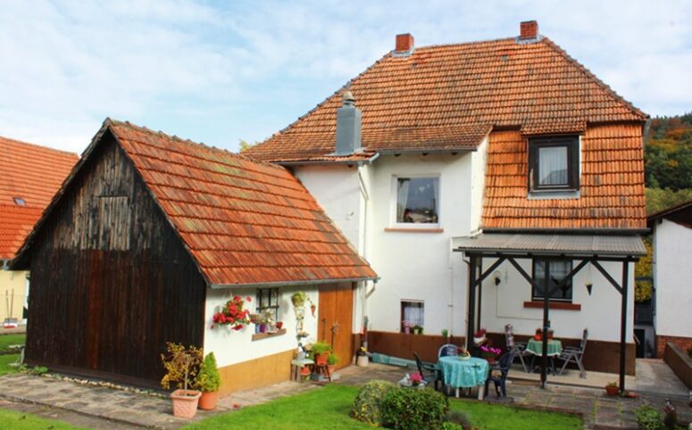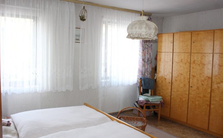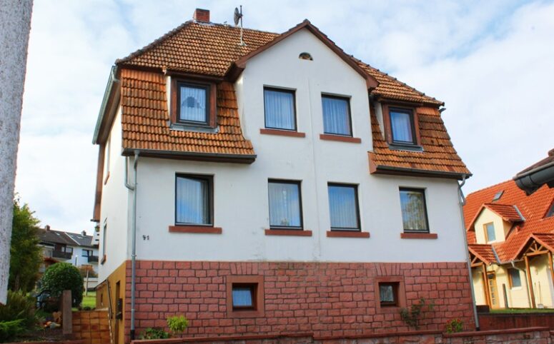 Das Haus befindet sich am hinteren Teil des Grundstücks mit Zugang von der Rückseite. Im Erdgeschoss liegen die Küche, das Esszimmer als Durchgangszimmer zum angrenzenden Wohnzimmer, ein Schlafzimmer sowie ein Duschbad. Im Obergeschoss befinden sich drei Schlafzimmer, ein weiteres Zimmer, das früher als zweite Küche genutzt wurde, sowie ein Wannenbad. Die Immobilie ist vollunterkellert; eine kleine Scheune ergänzt das Platzangebot. Auf der hinteren Grundstücksgrenze befindet sich das Carport. Der Garten ist überwiegend ebenerdig und lässt sich vielseitig nutzen.