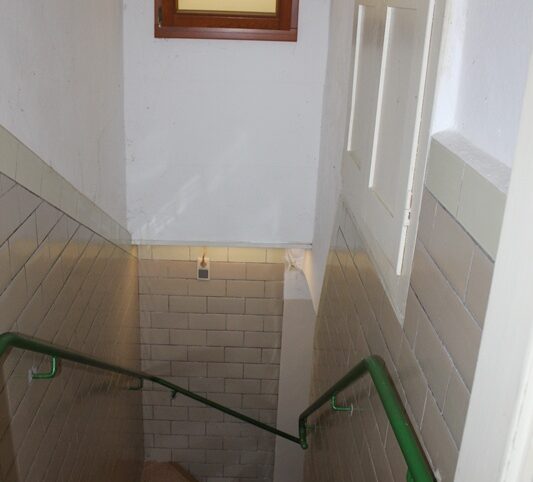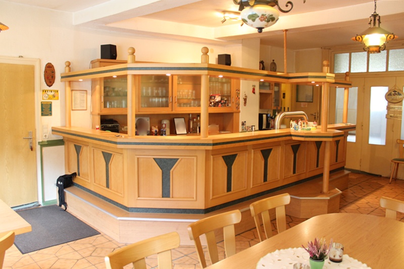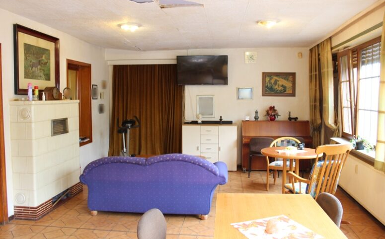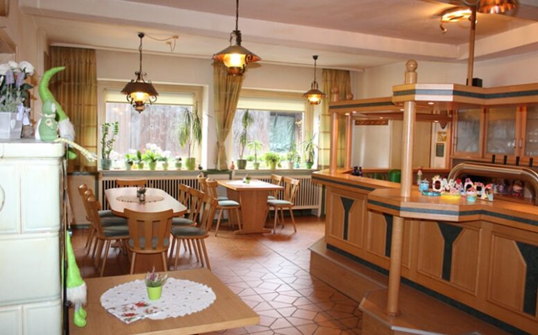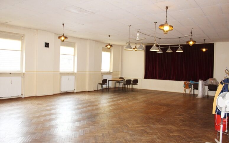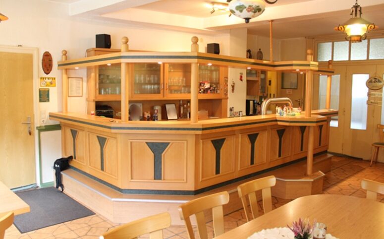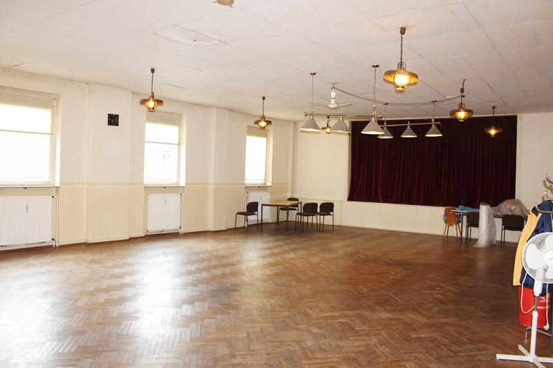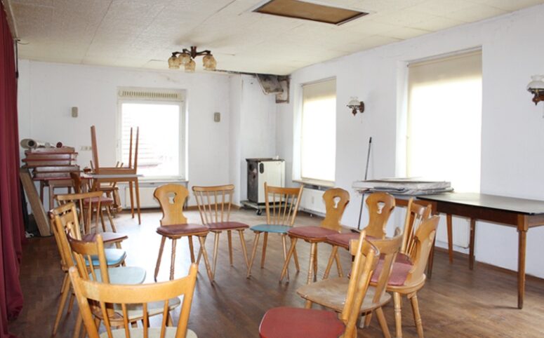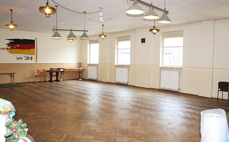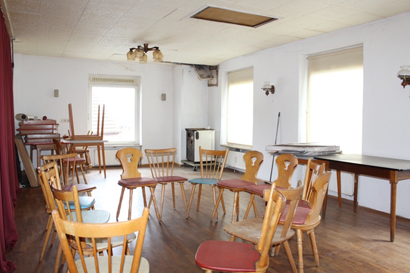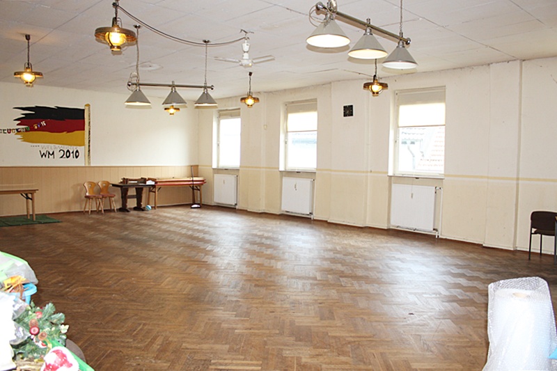 Gewerbeeinheit im EG: Gastraum mit voll ausgestattetem Tresen und Bestuhlung (20 Sitzplätze). Die Einrichtung stammt aus dem Jahr 2008. Ein Nebenraum – bisher als Raucherraum genutzt. Ein großer Saal mit angrenzendem Bühnenraum. Eine kleine Küche inkl. Einbauküche, ein Aufenthaltsraum/Personalraum. Damen- und Herrentoiletten aus den 70er-Jahren im Kellergeschoss.