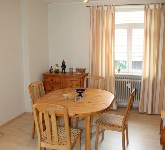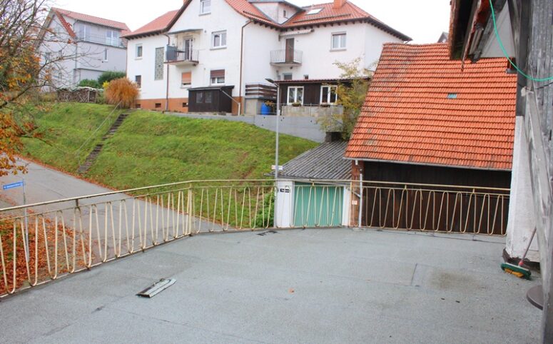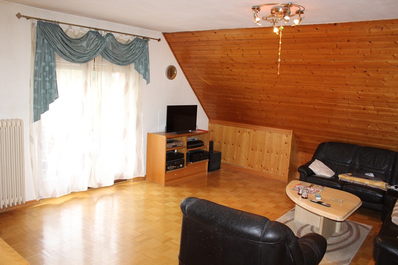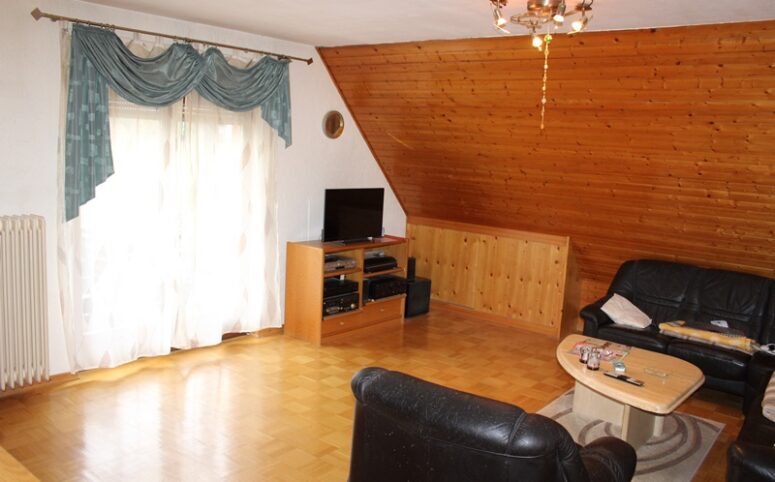 DG: Gepflegte Wohnung mit Wohnzimmer, direkter Zugang zum kleinen Balkon und Außentreppe auf die Dachterrasse und Dachboden oberhalb des Saales. Schlafzimmer, ein weiteres kleines Zimmer – nutzbar als Büro oder Gästezimmer, Vollbad mit Badewanne, Dusche, Tageslicht und Elektro-Durchlauferhitzer.