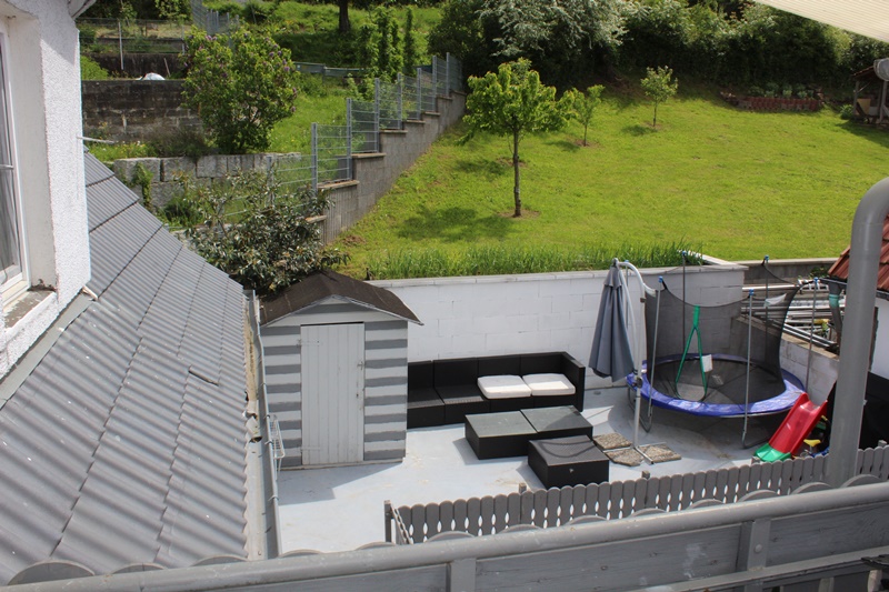 Große Dachterrasse mit Süd-Westausrichtung, voll unterkellert, Hauswirtschaftsraum im KG, Hof als Parkplatz nutzbar, Öl-Zentralheizung.