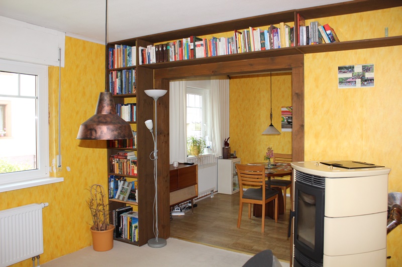 EG (erhöht): Breiter Treppenaufgang, kleines Wohnzimmer mit Pelletofen und angrenzendem Esszimmer, Schlafzimmer, Küche, modernes Vollbad mit Tageslicht,